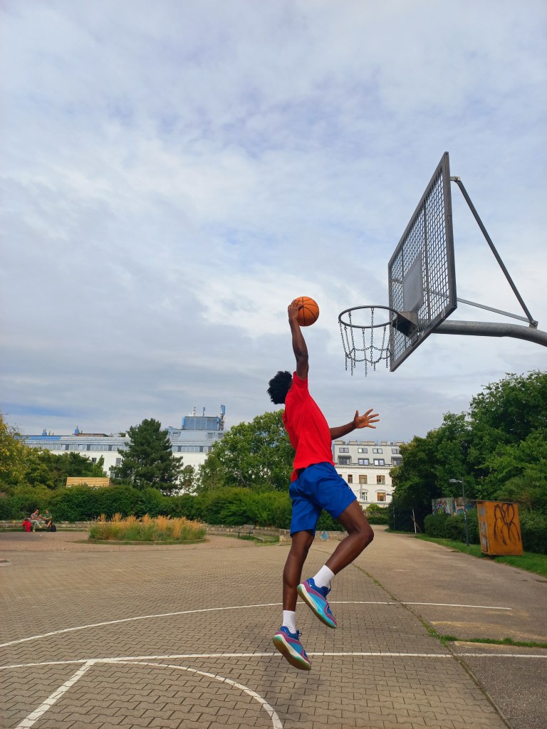 In seinem Verein spielt er Point guard, „weil ich viel sehe“. Er kann das Spiel lesen, Moves vorausahnen, seine Mitspieler einsetzen. Sein Lieblingsspieler ist Giannis Sina Ougko Antetokounmpo. Der 2,13 „Greek Freak“ spielt in der NBA bei den Milwaukee Bucks. Noch überragt er ihn um vielleicht 15 cm, aber Godfrey kann ja noch wachsen. Und dann hört man vielleicht mal von ihm, wenn er in der NBA seine Dunks macht…