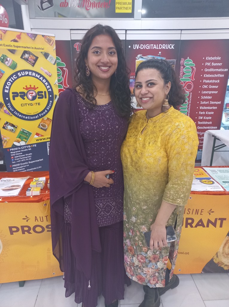 Greshma (30, rechts im Bild) und ihrer Cousine Anabel (24) geht es gut. Ich treffe die beiden am Nationalfeiertag in der Lugner City, wo sie bei einer Veranstaltung das Exotic World – Unternehmen PROSI ihrer Familie repräsentieren, das 1999 von Greshmas Vater Dr. Prince Pallikunnel gegründet wurde – Supermärkte in der Burggasse und im 21. Bezirk, „Prosi Indian Restaurant“ in der Kandlgasse, Kochkurse, Kostmetikgeschäft usw.