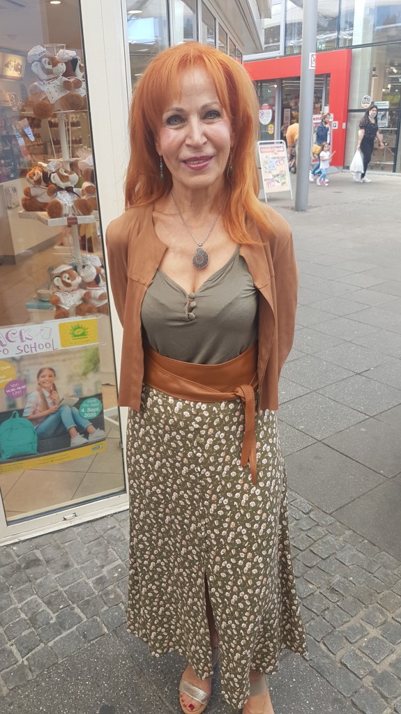 Gabi will mir nicht sagen, wie alt sie ist, ich schätze: „Mitte 50?“ Und sie antwortet fröhlich: „Danke!“ Das haben Sie schön gesagt!“ Es geht ihr gut, als ich sie vor der Pizzeria Casa D´Oro im EKZ in der Wiener Großfeldsiedlung im 21. Bezirk treffe, wo an diesem Tag der Wahlkampf von HC Strache, dem es gerade nicht so gut geht, beginnt. Es ist nicht viel los hier, ein paar solariumgebräunte Stiernacken in rosa Poloshirts mit aufgestellten Krägen stehen herum, und in der Pizzeria selbst spielt der Music Men mit „E“ im Namen „Rote Lippen soll man küssen“. Gabi ist ein Fan von HC, nicht vom Music Men. Sie ist politisch interessiert und hofft, dass er bei der Wahl den Einzug ins Stadtparlament schaffen wird, schon „aus dem demokratischen Gedanken heraus. Er wäre ein kleines Gewicht dabei.“Gabi war den ganzen März über noch in Thailand auf Koh Samui, kam mit einem der letzten Covid-Flieger der Lufthansa zurück und ging in Quarantäne, „was die Voraussetzung war, überhaupt mitgenommen zu werden.“ Vor zwanzig, dreißig Jahren entschied sie sich für ihre schöne Haarfarbe, um die sie sich nun alle vier Wochen kümmern muss, „je älter ich werde, desto öfter“, lacht sie. Und ihre dazu farblich abgestimmte Kleidung? „Ich ziehe mich nach Gefühl an, schaue, ob ich mich wohl fühle, und dann paßt es.“ Sie lebt in einer Beziehung und hat eine erwachsene Tochter.