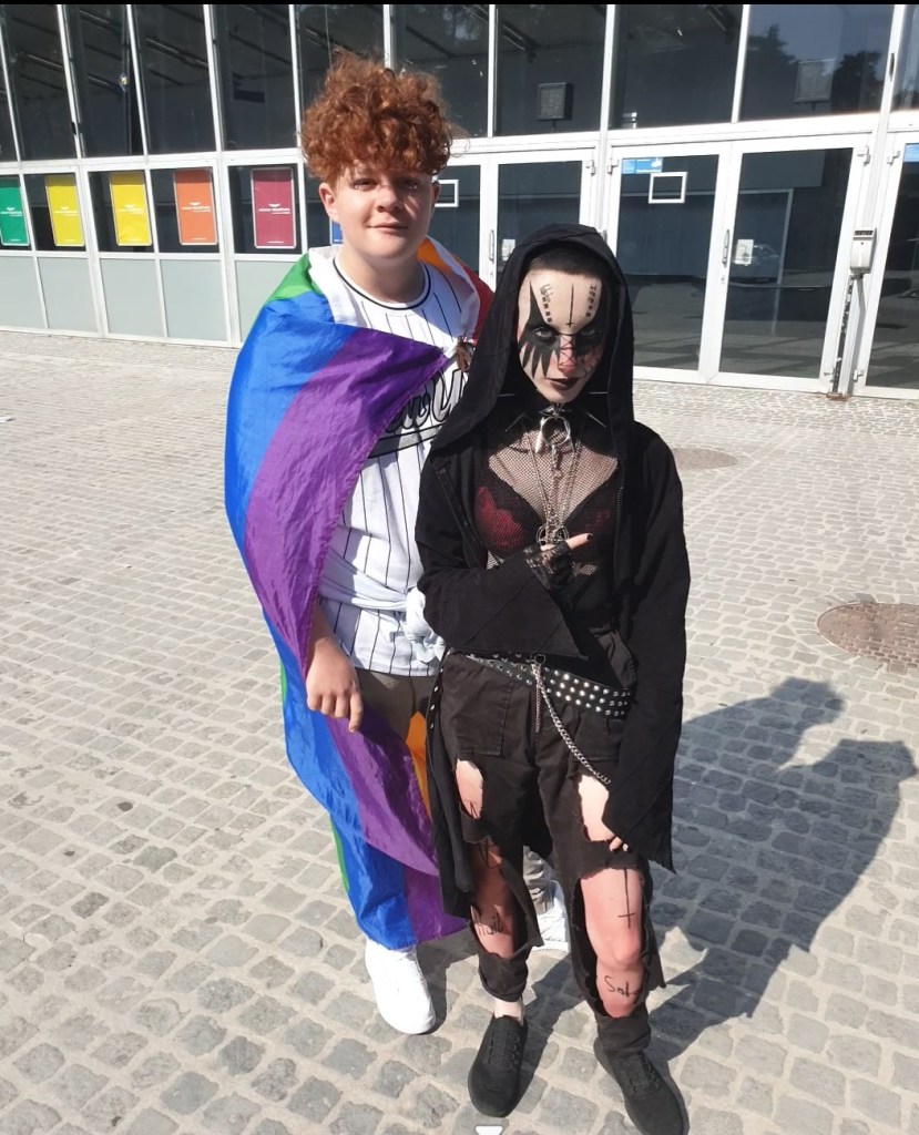 Meri und Marlon sind jeweils 15 Jahre alt. Ich treffe die beiden guten Freunde am Pride Day in aller Herrgottsfrüh vor der Wiener Stadthalle, wo sie sich auf Covid testen lassen, um den langen Tag inklusive Parade auf der Ringstraße genießen zu können – sie sind negativ! Die Beiden leben in einer WG. Marlon steht „seit eineinhalb Jahren auf Burschen“, Meri auf Mädchen. Bei Marlon lief die Identitätsfindung „ganz easy“ ab, wie er erzählt, Anfeindungen oder Probleme gab es nicht. Bei Meri dauerte es hingegen ein wenig länger, bis sie wußte, was sie wirklich mag: „Am Anfang hab ich halt gedacht, es müssen Burschen sein, aber jetzt weiß ich, dass ich auf Mädchen stehe.“ Meri wendet jeden Tag in der Früh „58 Minuten bis eineinhalb Stunden“ für ihr gutes Styling auf, am schwierigsten wäre es, die richtigen Klamotten zu finden. Marlon hingegen braucht deutlich weniger lang für seine schönen roten Haare, die er „von der Mama geerbt“ hat, wie er erzählt. Ob Meri ihn, als gute Freundin, mit seiner Frisur attraktiv findet? „Naja“, lacht sie, und Marlon lacht mit ihr. Marlon macht gerade die 9. Schulstufe fertig und möchte danach Maskenbildner werden, „das hat mir immer schon getaugt“, sagt er, irgendwas mit Film oder Theater soll es werden. Meri wird ab Oktober wieder in die 9. Klasse einsteigen und möchte danach eine Ausbildung zur Einzelhandelskauffrau absolvieren, „am liebsten bei Rattlesnake oder so“. Oder sie wird „etwas mit Obdachlosen machen, denen ich jetzt schon ehrenamtlich helfe.“ Sagt es, und verabschiedet sich mit Marlon in einen langen Regenbogentag.