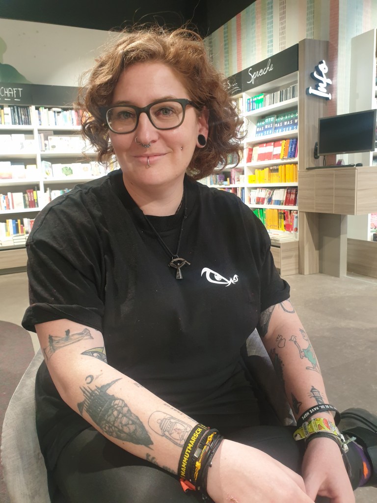Anna Maria ist 34, es geht ihr gut. Ihre Haut zieren gezählte 49 Peckerl, das erste ließ sich die Buchhändlerin 2006 im oberösterreichischen Ohlsdorf stechen. Dort hat es neben dem Thomas Bernhard auch einen Tätowierer gegeben, „der hat ‚Il Papa’ geheißen, weil er Pabst mit Nachnamen hieß, und der war der einzige in der Gegend Vöcklabruck/Gmunden, der überhaupt was hat stechen können und auch von meinem Exfreund den eineiigen Zwillingsbruder von Kopf bis Fuß tätowiert hat – so was siehst du in OÖ auch heute nicht so oft.“ Der Metal-Fan trug damals noch „Vögele-Jeans und Hemden vom Bruder“ und gab Il Papa eine Vorlage – einen Schach-Spinger – , sagte „So!“ Und so hat er es gemacht. „Damals hieß es noch, in der Tinte wäre Autolack drin!“
