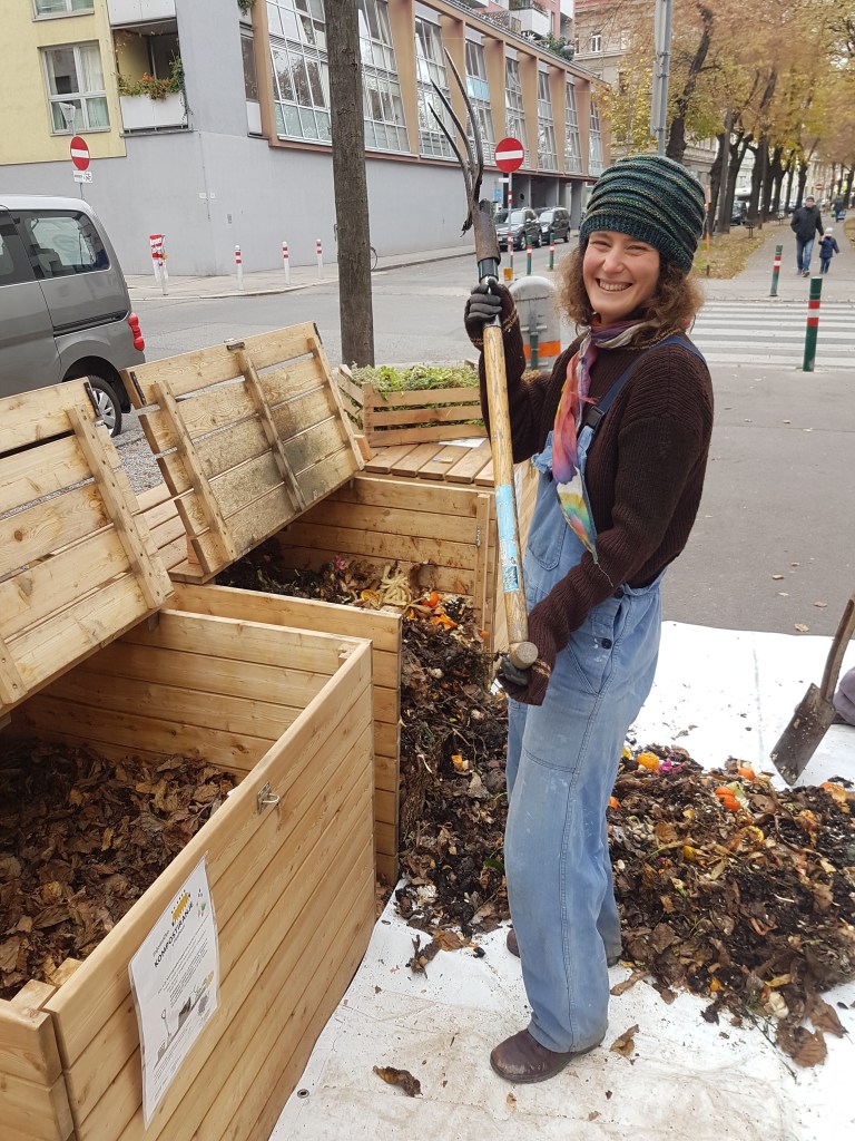 Jeder kann dann Kompost für seine Balkon- oder Zimmerpflanzen verwenden, wir ernten gemeinsam und teilen dann auf. Cordula schätzt vor allem auch den gemeinschaftlichen Aspekt des Kompostierens, die Kisterl sind mehrsprachig beworben, allzu viele sogenannte „Ausländer“ kompostieren aber noch nicht. „Wird schon!“, ist Cordula zuversichtlich, denn: „Immer mehr Leute sagen, ihre Bioabfälle tun ihnen fast leid, wenn sie diese in die MA48 Tonne werfen“, zu den Fahrradschläuchen, Fauteuils und Pizzaresten, die man darin findet. Superstreng sind sie bei ihrer Sammlung auch nicht. „Bananenschalenpickerl dürfen rein, mein Gott, ist ja nur Papier. Zu exklusiv wollen wir nicht sein.“  Ich verspreche, meinen Kaffeesud vorbeizubringen, „Danke, Kaffeesud ist super.“